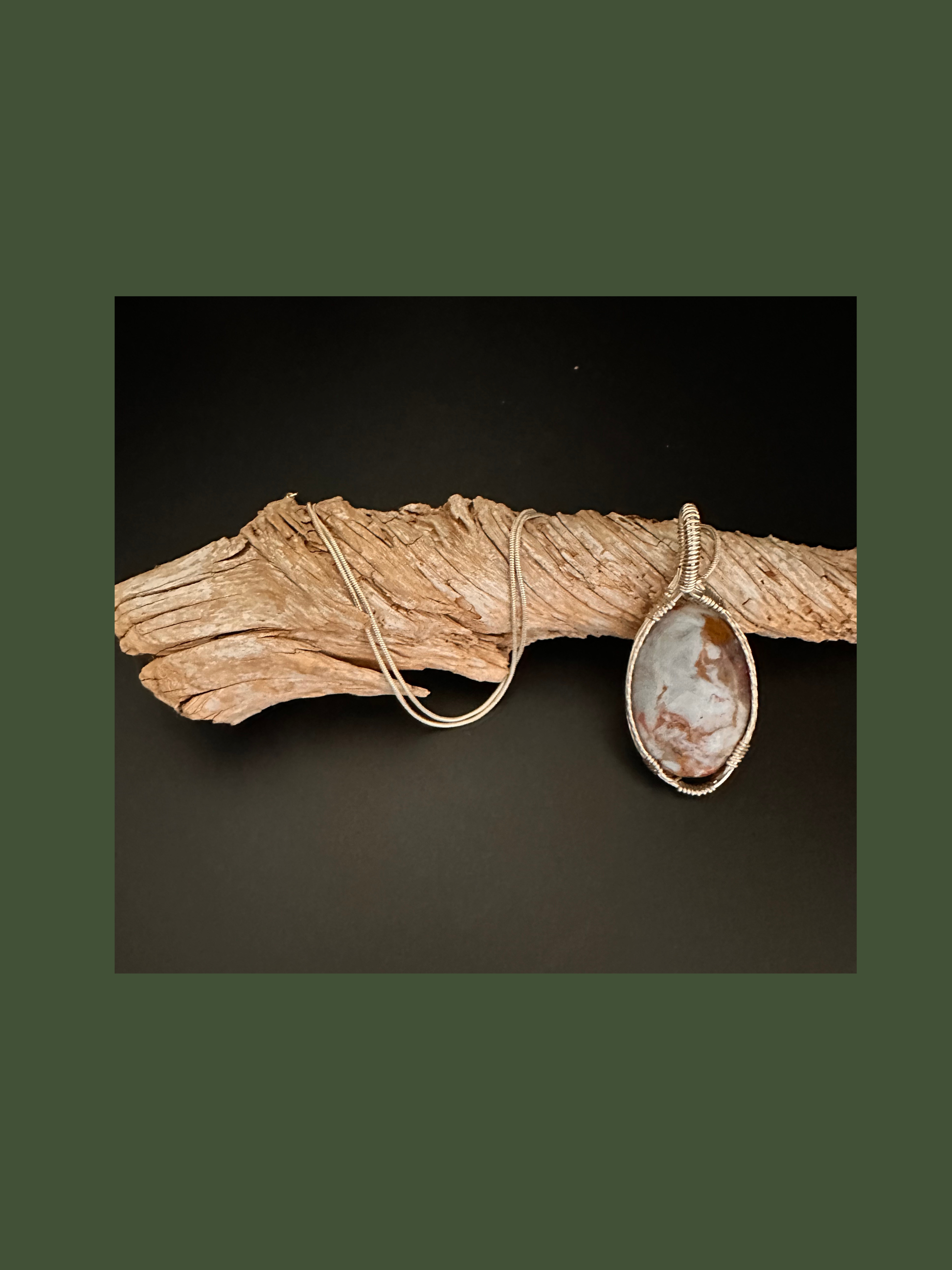 This beautiful agate stone has been smoothed into an oval shape and hand adorned with elegant silver bezels and chain.